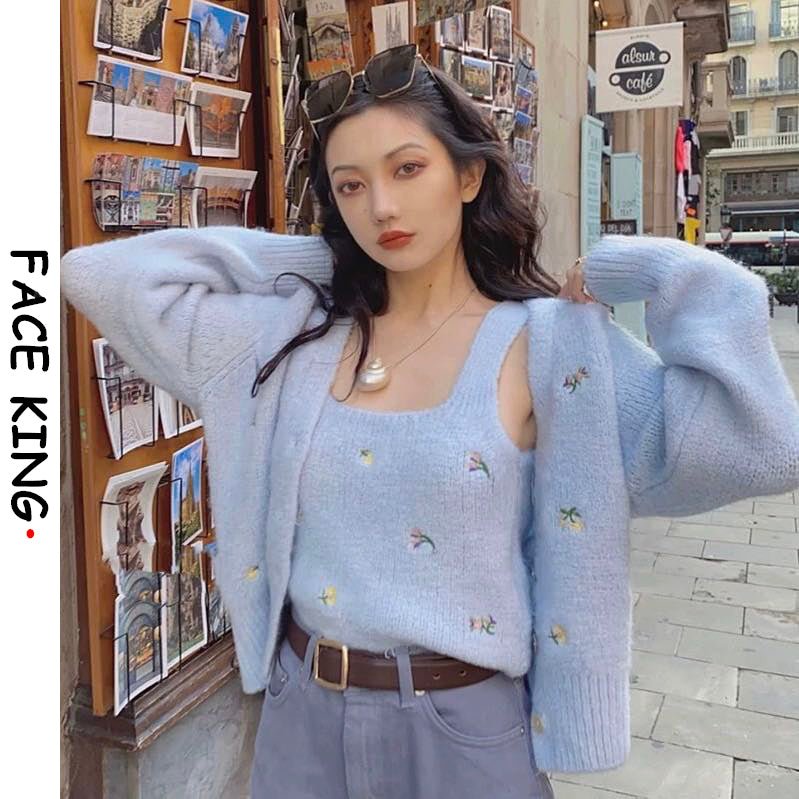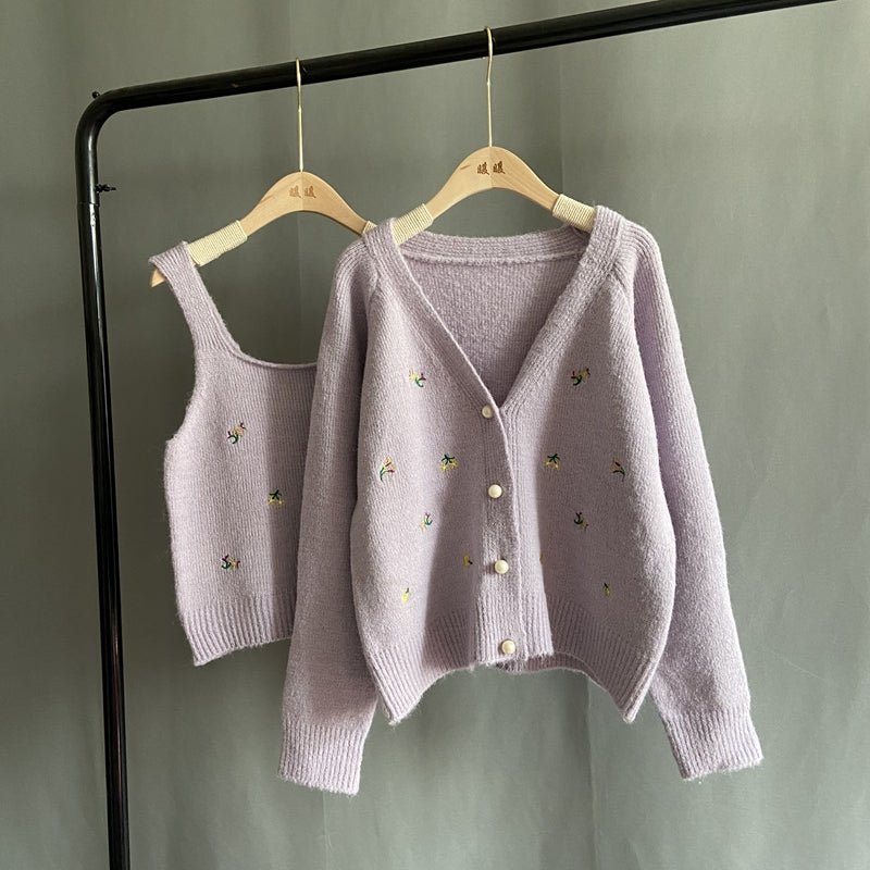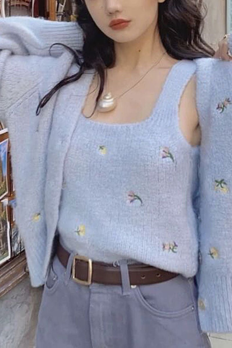 This embroidered knitted cardigan sweater set comes in a soft, contrast floral embroidery, v neckline, button up, wide strap crop top tank top two piece set and long sleeves short cardigans. The oversized embroidered sweater cardigan is popular with cami, tank, pants, denim, jeans, leggings, scarves or dresses, and get wrapped up & cozy feel with any layers underneadh.