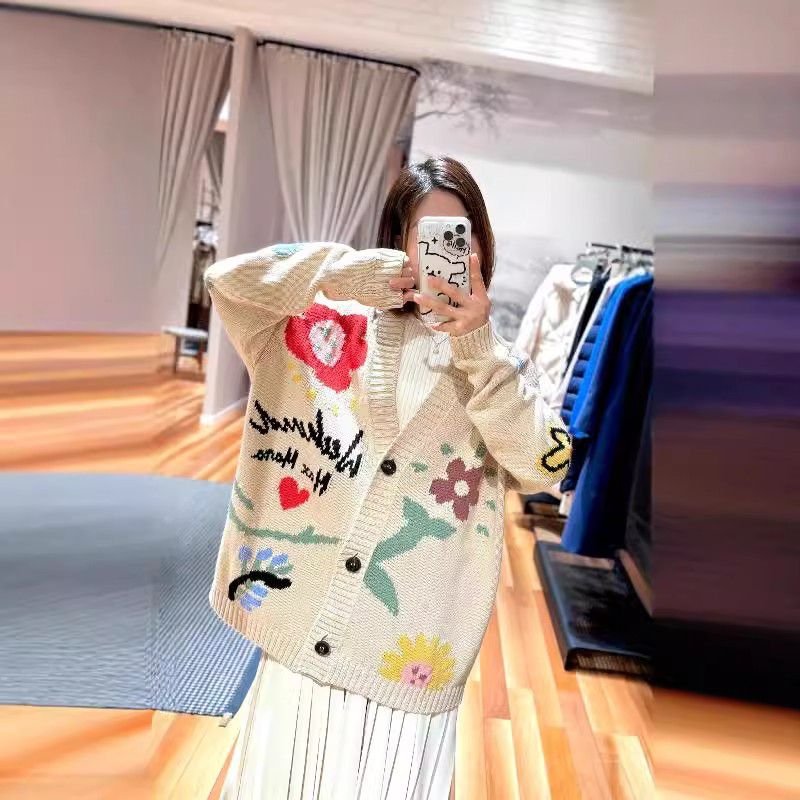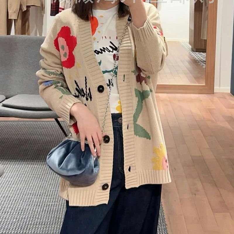 This white floral v neck cardigan features a rib knit design along the Y-neck, placket, hem, a button closure, logo-engraved horn hardware, and cuffs. The oversized knit intarsia floral sweater cardigan showcases intarsia graphics at the front and sleeves for a touch of elegance. Stay stylish and comfortable with dropped shoulders and an intarsia logo at the front, with cami, tank, pants, denim, jeans, leggings, scarves or dresses, and get wrapped up & cozy feel with any layers underneadh.