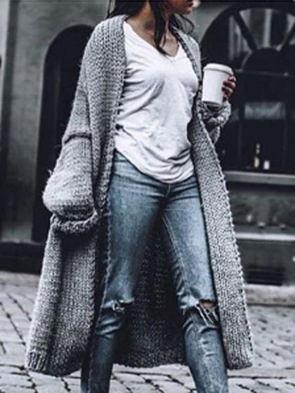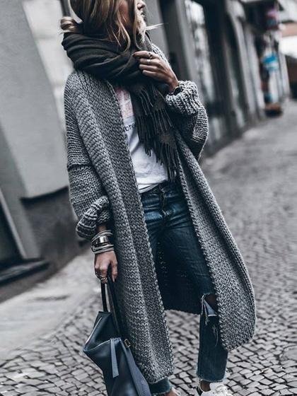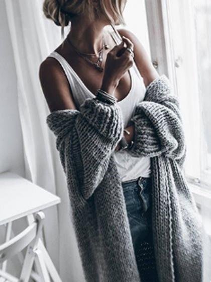 The knitted classic heavy thick open front long gray cardigan sweater features elastic ribbed knit, nice fitted outline and elastic retro cuffs. A must have basic womens black floor length long cardigan sweater coat for any underneath, such as cami, dress,tees, bodysuits, jeans and shorts.