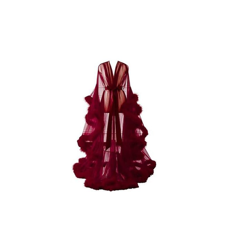 Design: See Throu,  Ruffle Hem, Frilled, Fuzzy Trimmed, Pom pom, Ruffle, Robes, Maxi Length and Trendy Style.
