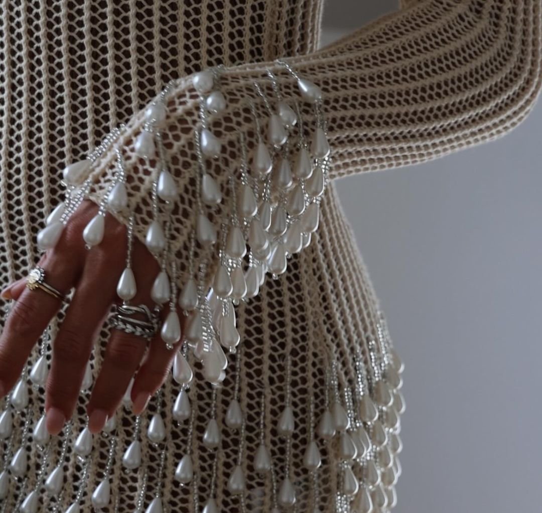 The beaded pearls fringe knit dress features expertly beaded waterdrop pearls, a semi mesh waffle knit, round neck and and long sleeves. The knit dress with fringing and faux pearl beads add a timeless elegance, making this the perfect choice for any occasion. Elevate your style with this unique and luxurious hollow out dress.